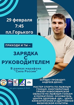 Зарядку проведет мастер спорта по лыжным гонкам, многократный призер Новосибирской области по лыжным гонкам и полиатлону Денис Андреев.