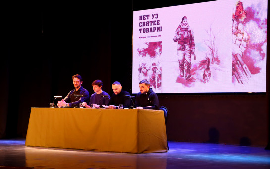 Собравшиеся могли послушать презентацию избранных произведений второго сборника военной прозы и поэзии «Нет уз святее товарищества». Книга издана фондом «Защитники Отечества» под редакцией писателя Захара Прилепина. Артисты театра озвучили сюжеты, написанные участниками и ветеранами СВО.